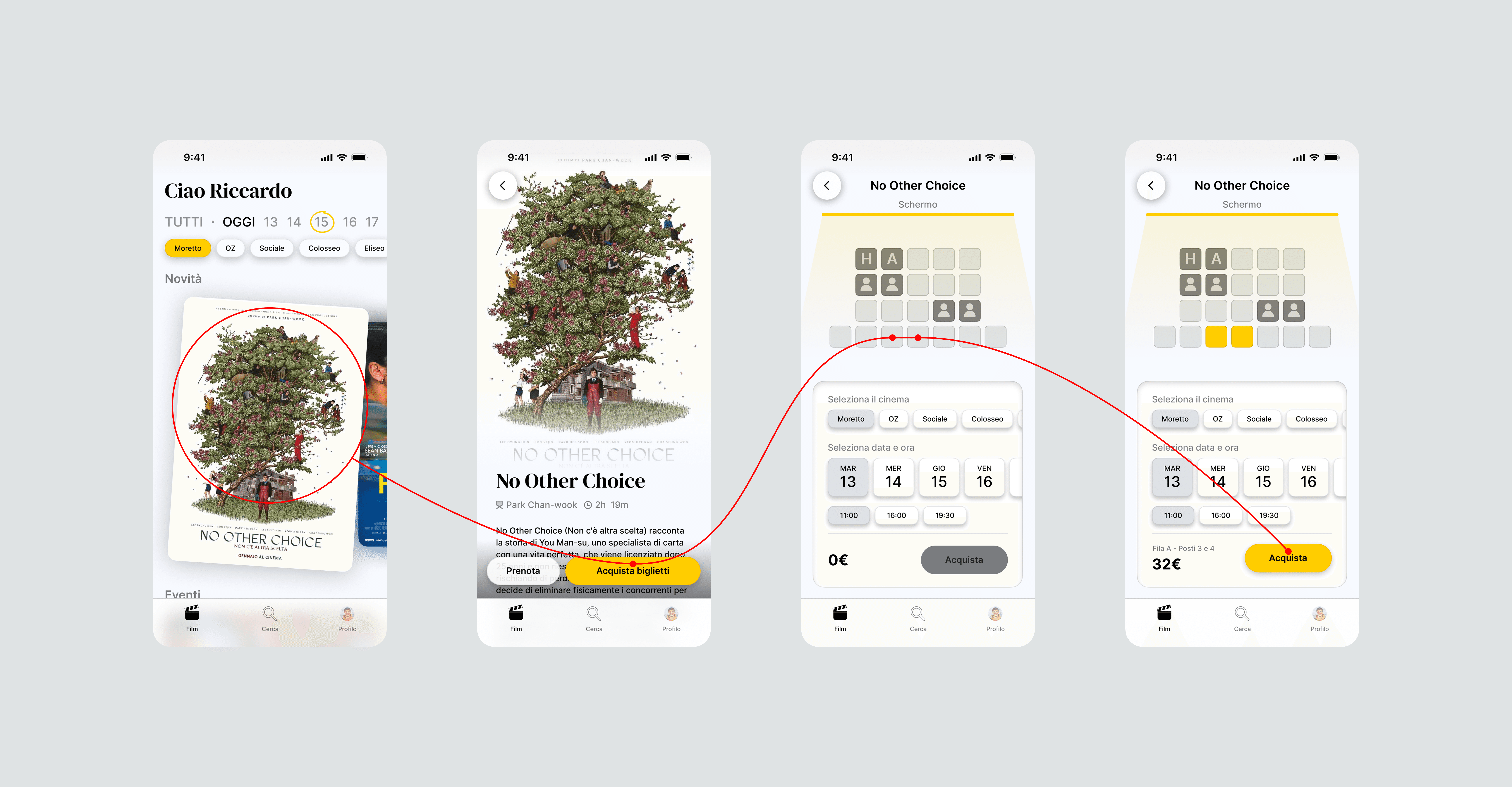 This project is a UX/UI redesign concept for the mobile application of Il Regno del Cinema, a cinema chain based in Lombardy with multiple venues between Brescia and Milan. The redesign originates from direct user experience with the existing service, which presented an outdated interface and a ticket-purchasing flow that was fragmented and difficult to navigate.