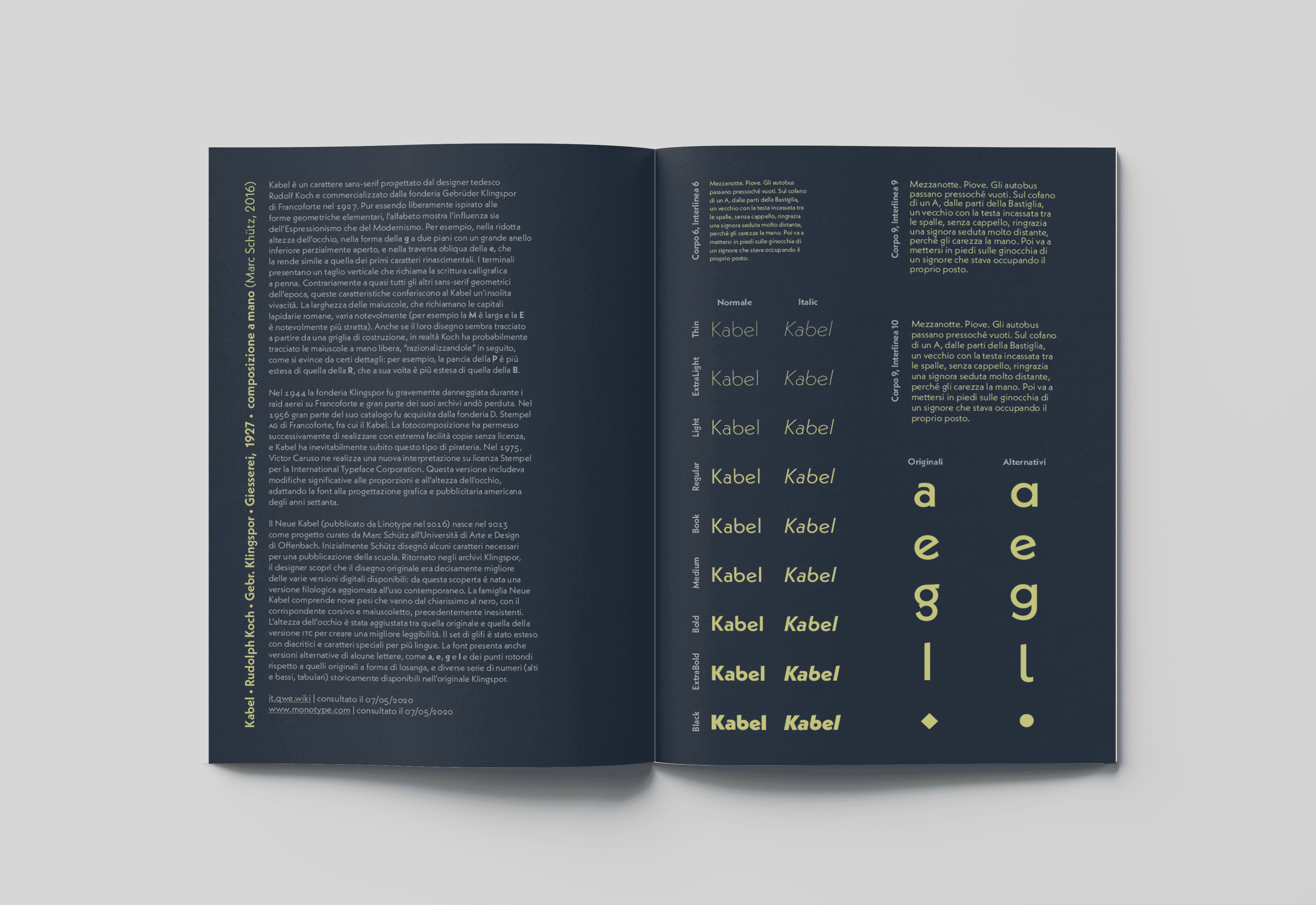 This specimen explores Kabel, the typeface designed by German designer Rudolf Koch and released by the Gebrüder Klingspor foundry in Frankfurt in 1927. The project highlights the font’s distinctive aesthetic—rooted in basic geometric shapes yet enriched with elegant, calligraphic nuances—through a carefully considered use of color.
